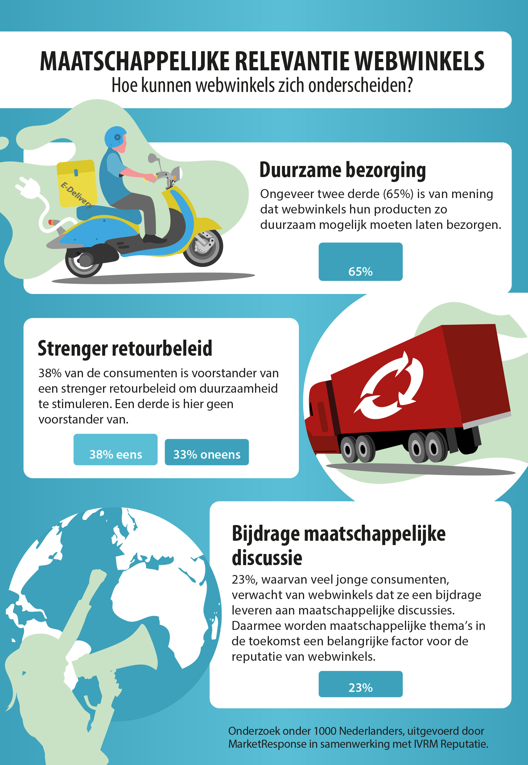 Het belang van duurzaamheid, bijvoorbeeld op het vlak van het retourbeleid van webwinkels, wordt in het onderzoek breed erkend. Van de ondervraagde consumenten vindt 67 procent dat webwinkels moeten zorgen voor een zo duurzaam mogelijk retourbeleid. Ook vinden veel consumenten (61 procent) dat webwinkels openheid moeten geven over of de producten die ze verkopen duurzaam geproduceerd zijn.