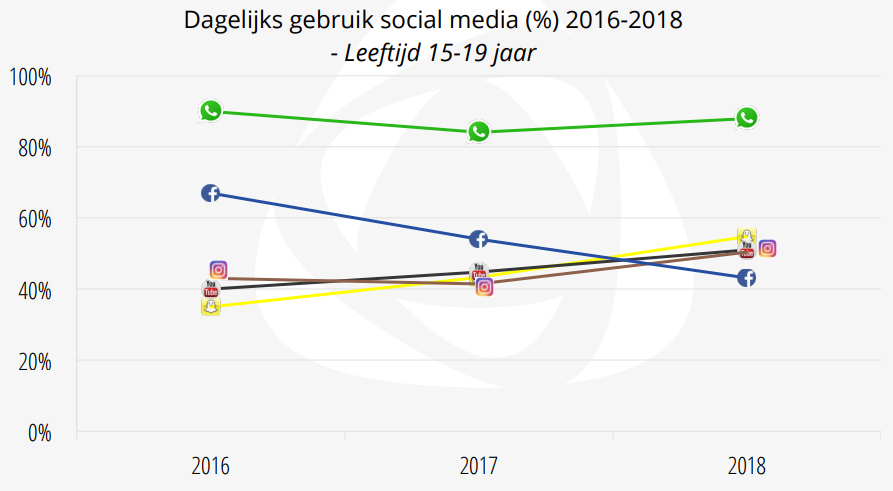 Naast dat jongeren zeggen zich niet meer thuis te voelen op Facebook, vinden de jongeren andere social media (met name Instagram en Snapchat) nu gewoonweg leuker. We zien in de data dat het gebruik van Instagram, Snapchat en YouTube onder jongeren van 15 tot en met 19 jaar relatief sterk zijn toegenomen. Vrijwel alle jongeren gebruiken WhatsApp, maar ook YouTube is vaste prik. Instagram en Snapchat worden inmiddels door net zoveel jongeren gebruikt als Facebook.