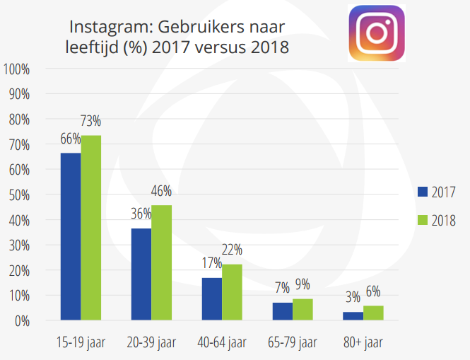 Daar waar het gebruik van LinkedIn relatief gelijk bleef het afgelopen jaar, maakt Instagram een flinke groei door. Instagram wordt door 4,1 miljoen Nederlanders gebruikt, een groei van 28 procent. Nederlandse Instagrammers zijn de foto-app ook flink meer gaan gebruiken: 2,1 miljoen mensen gebruiken het dagelijks, 40 procent meer dan in 2017.