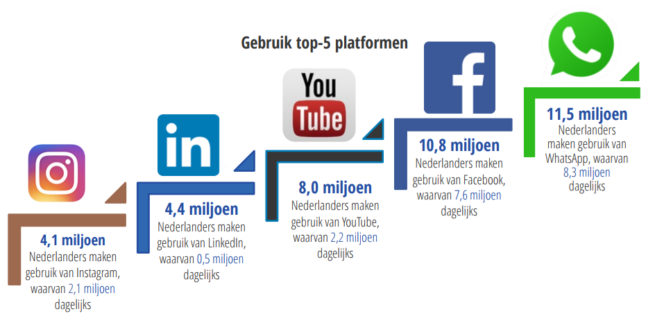 WhatsApp is nog altijd het meest gebruikte sociale medium in Nederland. Maar liefst 11,5 miljoen Nederlanders gebruiken het om te communiceren met collega’s, vrienden en familie. De messengerdienst wordt gevolgd door Facebook, dat door 10,8 miljoen Nederlanders wordt gebruikt. Het dagelijks gebruik van WhatsApp is het afgelopen jaar toegenomen, terwijl het percentage Facebookgebruikers dat het sociale netwerk dagelijks gebruikt afnam.
