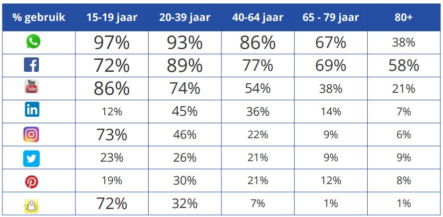 Facebook heeft nog altijd sterke positie in leeftijdscategorieën 20 jaar en ouder. Voor veel Nederlanders is Facebook nog altijd hét sociale medium. Het gebruik van WhatsApp en Instagram groeit in bijna alle leeftijdscategorieën. In onderstaande grafiek is te dat ook oudere Nederlanders Instagram steeds vaker weten te vinden.