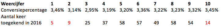 Een kanttekening die gemaakt moet worden, is dat de weercijfers 1 en 10 (logischerwijs) het minst werden toegekend in 2016. Zie de onderstaande tabel voor een overzicht van de gemeten weercijfers. In 2016 waren er 5 dagen waarop het weer het cijfer 1 kreeg en 14 dagen waarop het weer een cijfer 10 heeft gekregen. Een enkele dag meer of minder bij deze weercijfers oefent een grotere invloed uit dan een dag meer of minder op dagen met het weercijfer 5. Om met meer zekerheid uitspraken over de invloed van het weer op het conversiepercentage te kunnen doen, hebben we een limiet gezet waarbij het weer minimaal 20 dagen een bepaald cijfer moet hebben gekregen, voordat deze meetelt in het onderzoek. Dat betekent dat enkel de dagen met weercijfers van 3 t/m 9 zijn meegenomen in het verdere onderzoek.