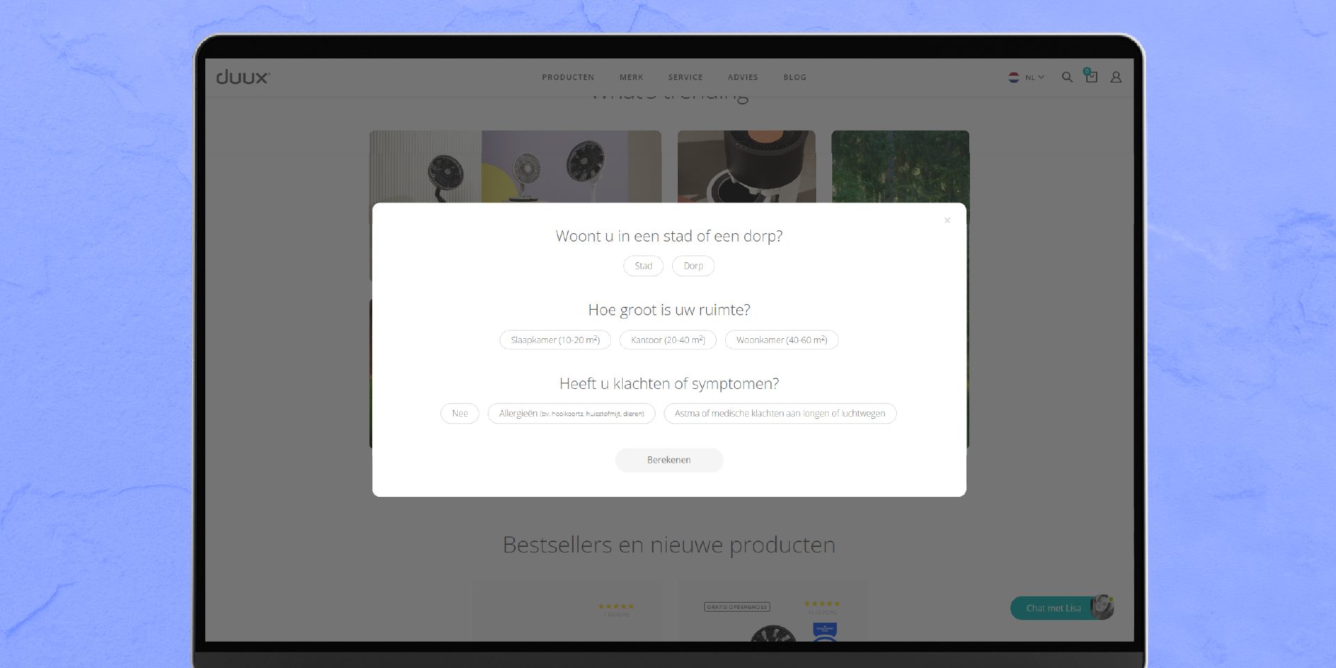 Door vooraf goed na te denken over deze opties, kan hier een gebruiksvriendelijke keuzehulp voor ontwikkeld worden, die een advies geeft in de vorm van de beste optie(s). In het voorbeeld van Duux zoals hierboven weergegeven, kan je op basis van drie simpele vragen ontdekken welke luchtreiniger het beste bij je past, op basis van jouw specifieke situatie.
