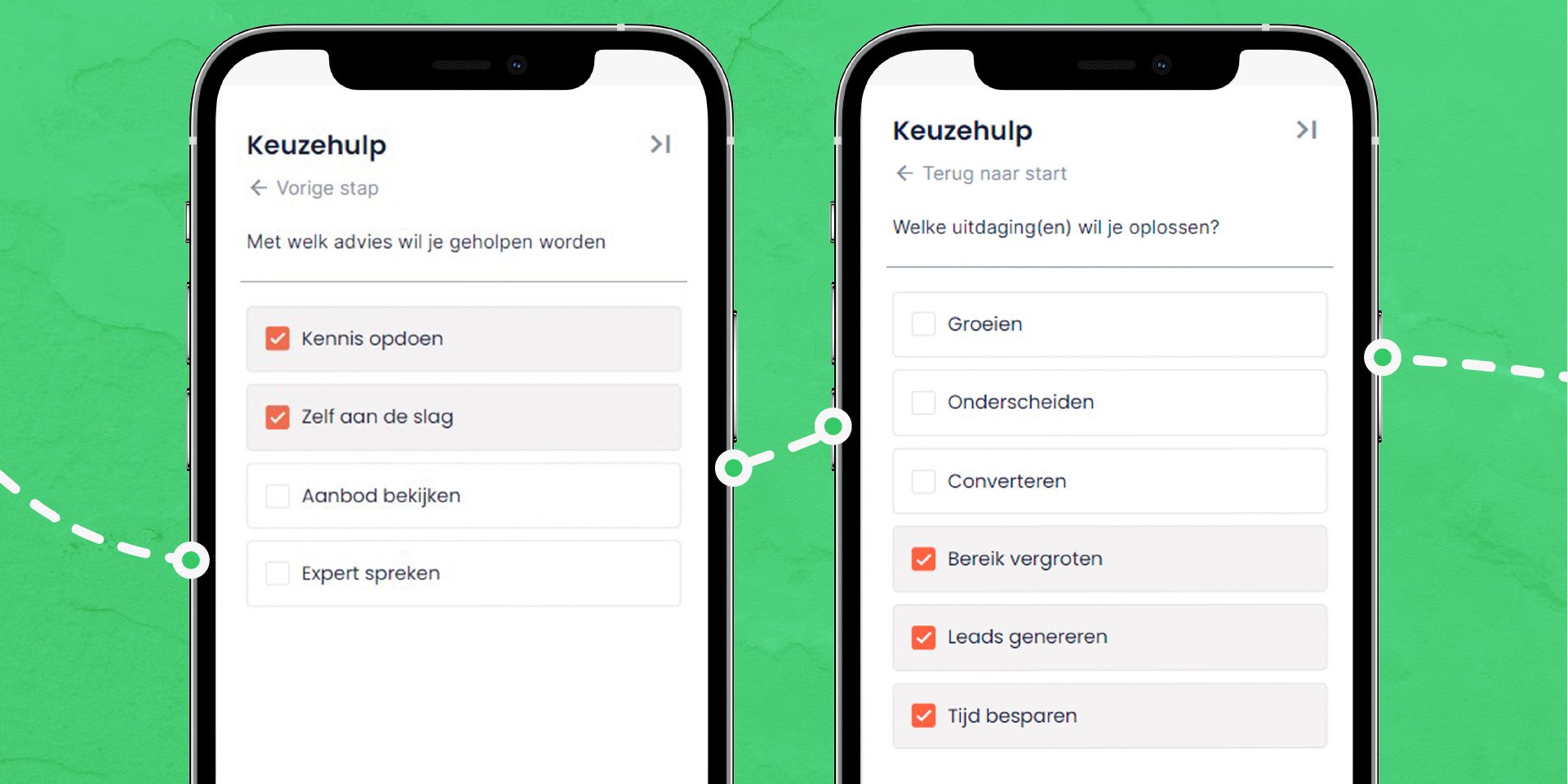 De makkelijkste manier om gebruikers te sturen is met een keuzehulp. Dit is een advies tool die in je website kan worden geïmplementeerd of op maat kan worden gemaakt, en die op basis van antwoorden van een gebruiker een specifiek advies genereert.