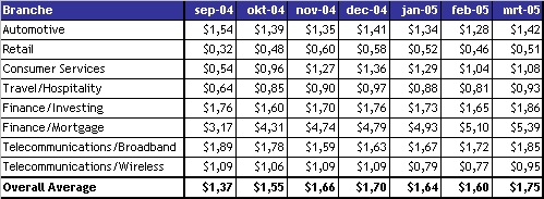 Op basis van de 500 meest gezochte zoekwoorden in 8 branches, publiceren Fathom Online en MediaPost sinds oktober 2004 maandelijks een Keyword Price Index (KPI) per branche. Dit zijn de gemiddelde kosten-per-klik voor trefwoorden binnen een bepaalde branche. Zagen we in het laatste kwartaal van 2004 nog een stijging van 24 procent, in het eerste kwartaal van dit jaar blijkt dit ‘slechts’ 9 procent te bedragen (bron: Mediapost).