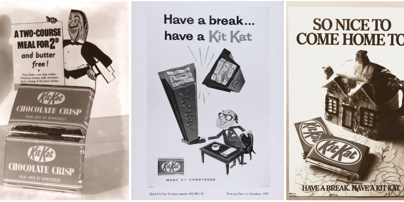 In die oorsprong zat dus al besloten dat het product bedoeld was als pauzesnack. Dik twintig jaar later werd dat idee expliciet onderdeel van de merkidentiteit, in de vorm van een slogan. Have a break, have a KitKat werd bedacht door Donald Gilles van reclamebureau JWT en dateert van mei 1957. Een jaar later verscheen de slogan in de eerste tv-commercials voor het merk.