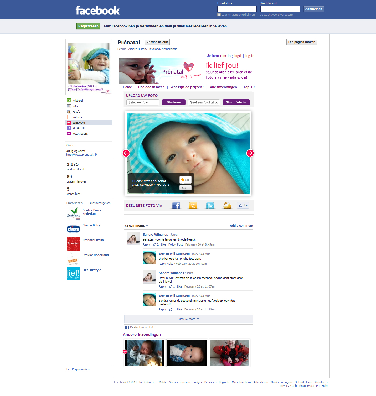 Van 14 februari (valentijnsdag) tot 25 maart 2012 werd een fotowedstrijd met het thema “ik lief jou” georganiseerd op de Facebook-pagina van Prénatal. De foto met de meeste stemmen wint een prijs waardoor het incentive hoog is om ingezonden foto’s te delen via Facebook, e-mail en Twitter.