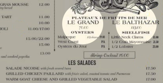 Nu verkoop je je huis waarschijnlijk niet zo vaak. Maar er zijn ook voorbeelden, die je dagelijks tegenkomt. Veel restaurants hebben bijvoorbeeld de gewoonte om naast alle gerechten één heel duur gerecht op de kaart te zetten. Het dure gerecht wordt zelden besteld. De restauranthouder maakt zich hier niet druk over. Het dure gerecht staat op de kaart omdat alle andere gerechten hierdoor goedkoper lijken. Wanneer er bovenaan de kaart een gerecht van €80 staat lijkt het gerecht van €30 dat daarna volgt opeens niet zo duur meer.