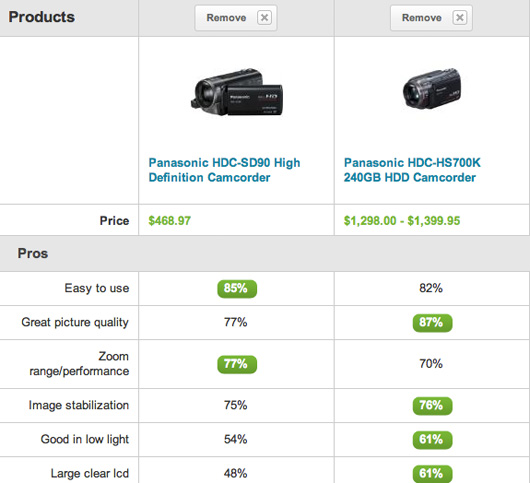 Het is een uitdaging om producteigenschappen die van zichzelf niet in een getal uit te drukken zijn toch kwantificeerbaar te maken. Op Buzzillions.com vragen ze mensen die een productbeoordeling schrijven de vijf beste en vijf slechtste producteigenschappen aan te geven. Met hun uitgebreide vergelijkfunctie kunnen mensen deze gegevens dan naast elkaar zetten. Zo zie je welke product op welke producteigenschap het best scoort.