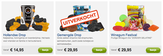 In onderstaand fictief voorbeeld staat een drietal producten naast elkaar waarvan er één is uitverkocht. Door te communiceren dat een product is uitverkocht, laat je zien dat deze en soortgelijke producten populair zijn en zet het die producten in een nieuwe context.