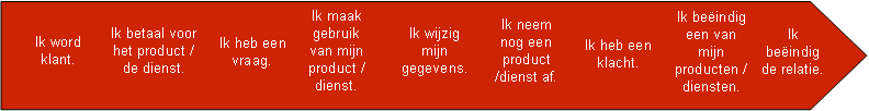 Het opstellen van deze keten is heel eenvoudig. Wat vaak goed werkt, is je eigen website bekijken en bekijken hoe daar bepaalde klantprocessen beschreven staan. 9 van de 10 keer heb je dan een behoorlijk compleet beeld van de stappen die de klant doorloopt. Vervolgens valideer je de keten met verschillende collega’s die allemaal een rol hebben in deze keten. Hieronder een voorbeeld van een klantketen.