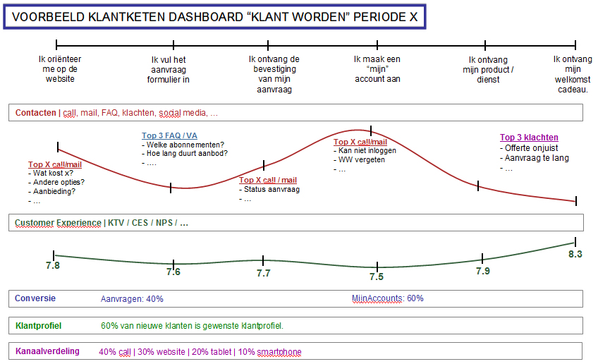 Wat wil ik namelijk nog meer weten: wat zijn mijn top x call en e-mail reasons in dit klantproces? Wat zijn de klachten die ik ontvang? Welke FAQ’s/virtuele assistent vragen krijg ik online? Hoe is mijn conversie percentage van de aanvragen? Hoe is mijn conversie percentage van de mijn omgeving? Hoe is de verdeling van de aanvragen over de kanalen (call, website, tablet, smartphone)? Door al deze informatie te combineren, heb je een integraal beeld vanuit customer experience, kanaalsturing en kostenefficiency. Deze drie gaan namelijk hand in hand als je ze op deze manier aan elkaar verbindt!
