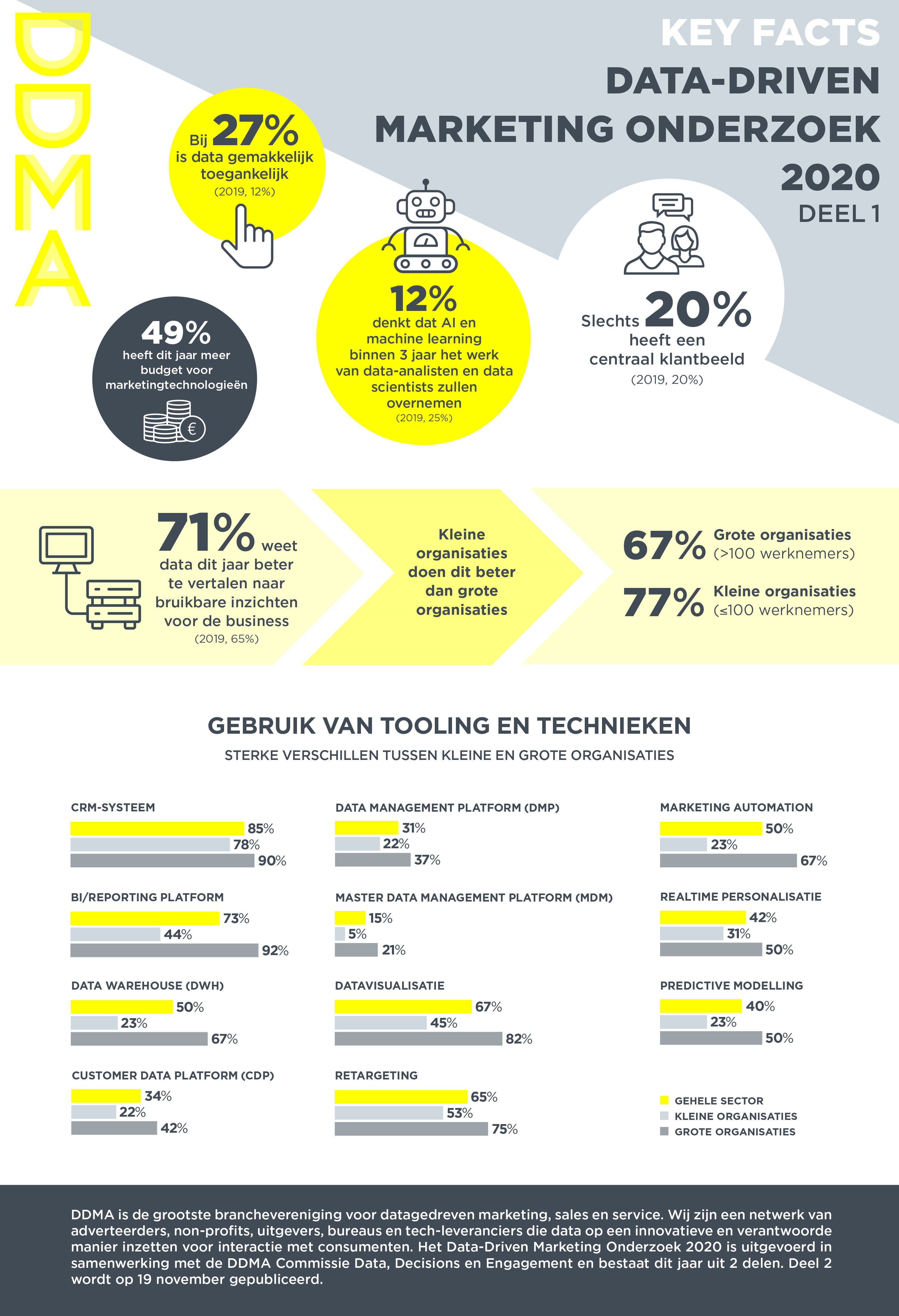 De beschikbaarheid van data is binnen organisaties in het afgelopen jaar sterk toegenomen. Het aantal organisaties waarbij iedere werknemer gemakkelijk toegang heeft tot data, is meer dan verdubbeld: van 12 procent naar 27 procent. Ook zegt bijna de helft (49 procent) dat er meer budget is voor nieuwe marketingtechnologie. Toch heeft – net als vorig jaar – slechts 20 procent een gecentraliseerd en actueel beeld van hun klanten.