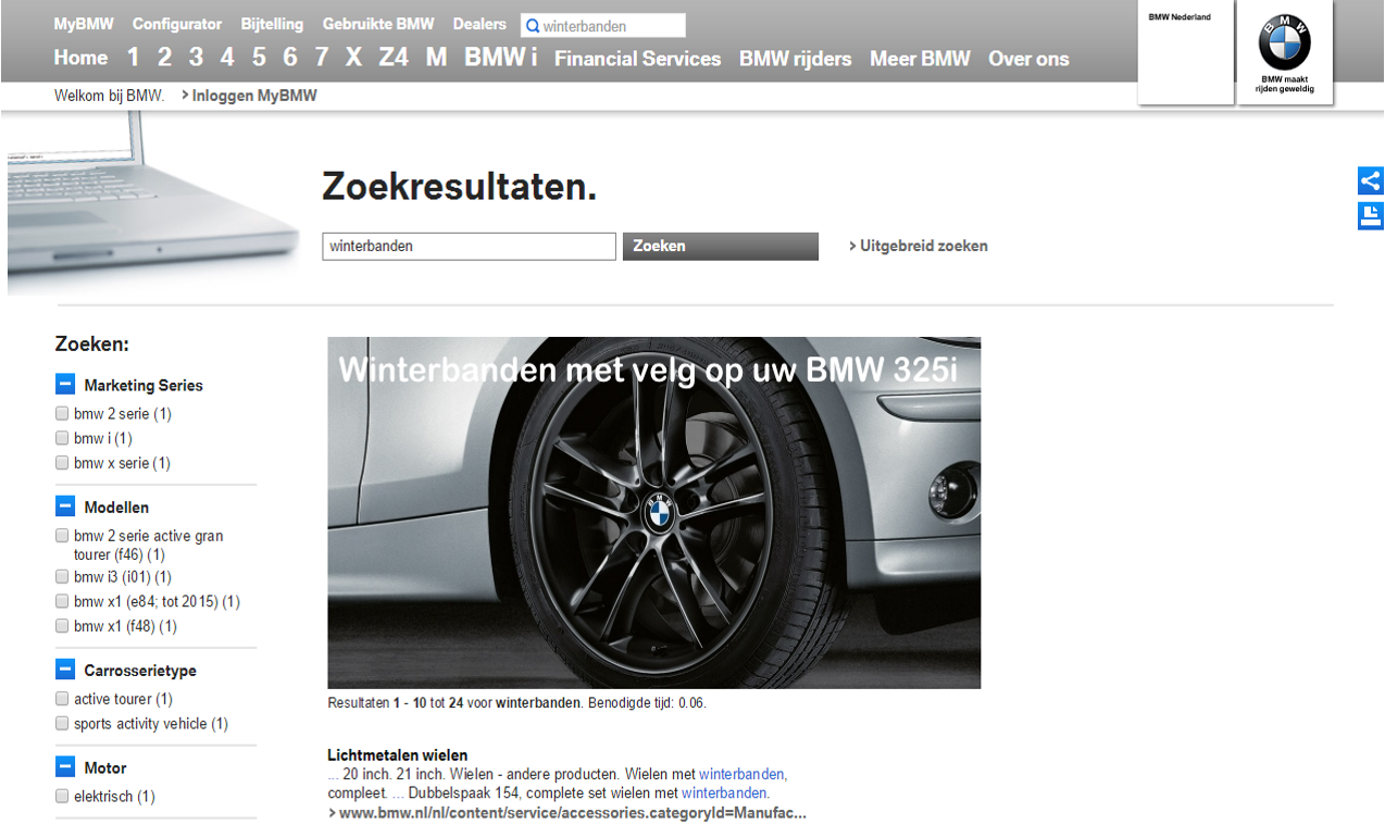 Stel dat iemand op de website van BMW zoekt op het woord ‘winterbanden’. Nu krijgt hij de standaard gegenereerde hits te zien. Maar als deze persoon in de Mijn-Omgeving is geweest (klantstatus: klant) en je hebt daaruit kunnen afleiden dat hij een BMW 325 heeft (productbezit: BMW 325), kun je beter in de zoekresultaten direct alle winterbanden laten zien die voor dat model geschikt zijn.