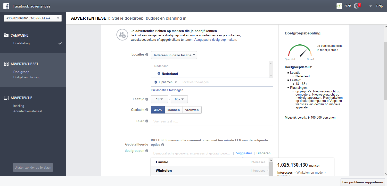 De volgende stap is het bepalen van de groep waarop je het gepromote bericht richt. Hoe specifieker je targeting, hoe groter de relevantie voor de gekozen groep. Het is dan ook niet verrassend dat berichten gericht op een kleine groep over het algemeen beter scoren op relevantie dan uitingen waarmee een groot publiek moet worden bereikt. En hoe relevanter, hoe meer mensen je bereikt per advertentie-euro. Mijn ervaring is dan ook dat berichten die al goed scoren voordat ze worden gepromoot en worden gericht op een specifieke doelgroep het meeste rendement halen. Vaak werkt het beter veel kleine campagnes te draaien dan één grote.