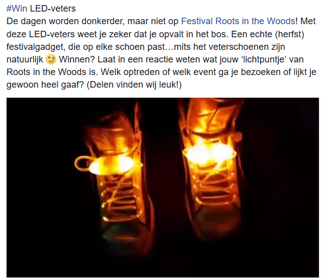 Tot slot op bovenstaand verhaal vol met analyses en testen. Het helpt als een bericht gewoon ‘leuk’ is om te delen. Bijvoorbeeld omdat het grappig, origineel of verrassend is. Hierin speelt creativiteit nog altijd een belangrijk rol. Onderstaand is een voorbeeld van een festival waar ik voor werk. Ondersstaande Facebook-post, met als prijs een set lichtgevende veters ter waarde van € 5,95 haalde een bereik van bijna 4.400 mensen. Met een 12-seconden video van een paar lichtgevende veters….