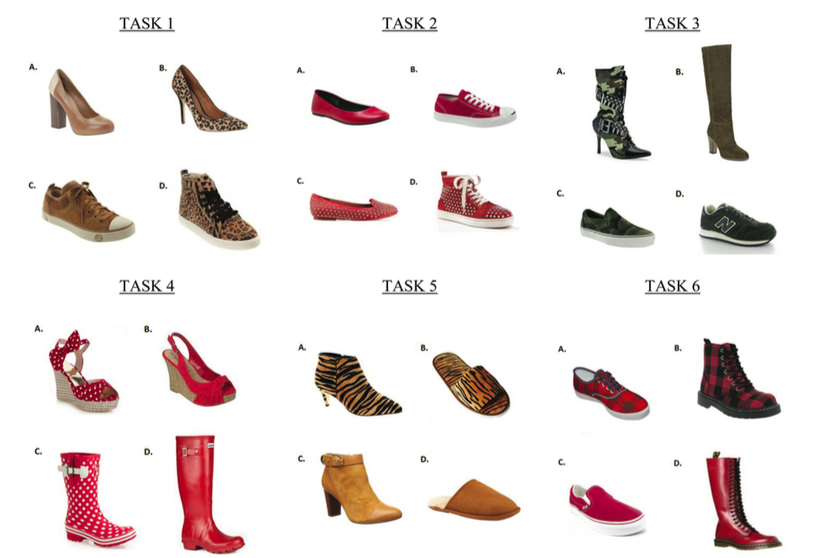 De respondenten van de studie kregen zes keer vier afbeeldingen te zien met diverse soorten schoenen en verschillende soorten designs waaronder luipaardprint, stippen, schotse ruit, et cetera.