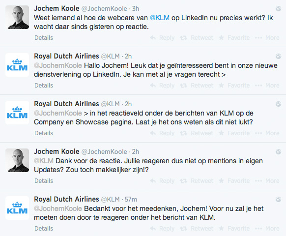 Wat vandaag duidelijk wordt, is de manier waaróp KLM de webcare op LinkedIn opzet. Op een vraag van Jochem Koole hierover antwoordt KLM dat mensen vragen kunnen stellen in de reactievelden onder de updates van KLM zelf op de Company- en Showcase-pagina. Je hoeft dus geen reactie te verwachten als je KLM zelf mentiont in een eigen update. Dat roept bij sommigen de vraag op of de LinkedIn-care niet vooral een PR-gimmick is.