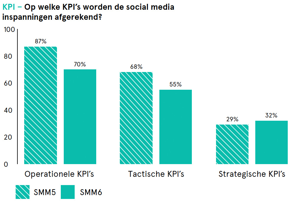 Tegelijkertijd laten merken nog kansen liggen. Zo is de rol van medewerkers in bijvoorbeeld PR nog vrij klein en vormt het inzetten van medewerkers als ambassadeurs van het merk nog duidelijk een opportunity. Ook worden social media maar door de helft van de merken gebruikt om insights uit de community te halen. Tot slot worden de resultaten van de socialmedia-inzet nog vrij ‘oppervlakkig’ afgerekend op operationale KPI’s – zoals de aantallen fans, followers, replies en mentions – terwijl de effecten ervan op het merk alleen door de voorlopers worden meegenomen in de berekening van de ROI.