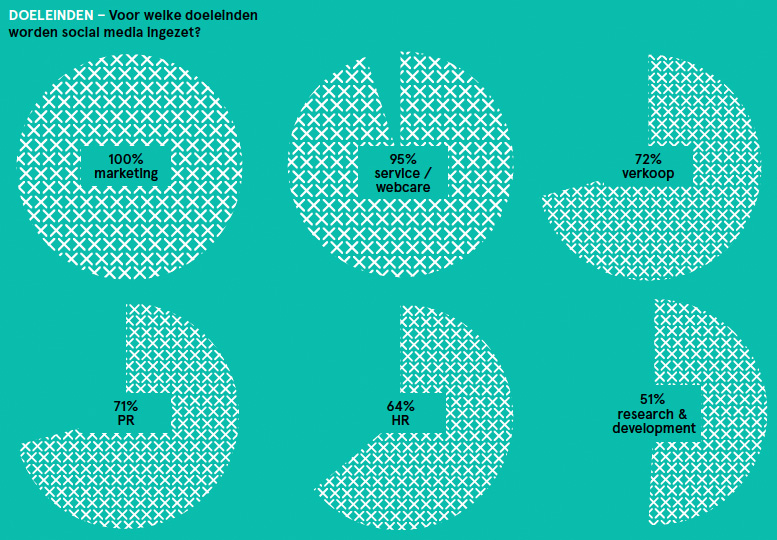 Met welk doel zijn de merken uit het onderzoek actief met social media? Ook hier zal het niet heel verrassend overkomen dat marketing de boventoon voert. Ondanks de campagnecycli binnen marketing, krijgt de inzet steeds meer een ‘always-on’-karakter in service/webcare – overigens moet daarbij wel worden opgemerkt dat slechts 16 procent van de merken ook buiten kantooruren actief zijn op social media. Verder is de PR-matige inzet in opkomst, waarbij bereik wordt opgebouwd bij en de dialoog gezocht met stakeholders, en is de inzet voor HR nog in veel gevallen ad hoc. Het luisteren naar consumenten en realtime inzichten verkrijgen