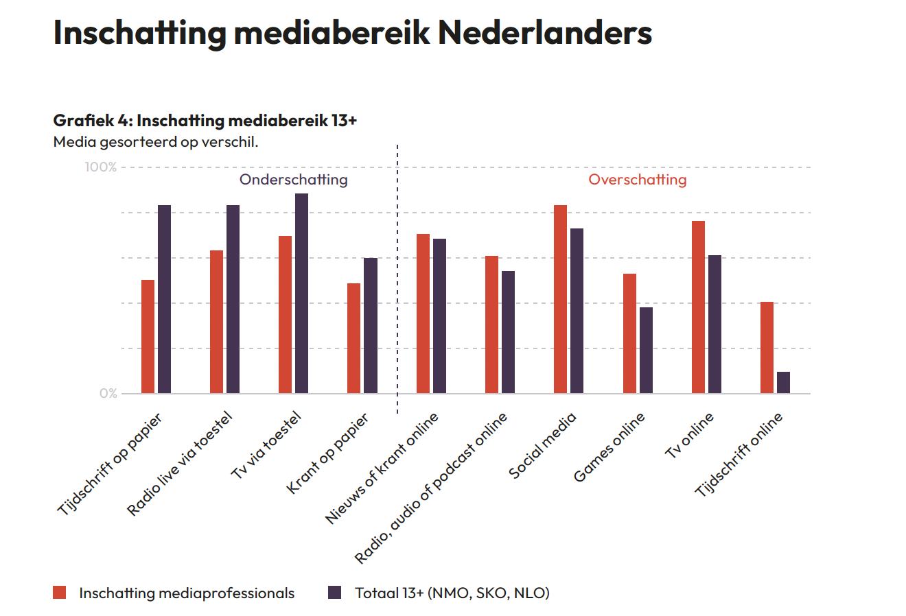 We kennen allemaal het fenomeen van de gepercipieerde werkelijk en de echte werkelijkheid. Keer op keer toont onderzoek aan dat als we mensen vragen om een inschatting te maken van een situatie dat de echte getallen niet kloppen met de inschattingen. We over- en onderschatten vaak de situatie. Zo las ik deze week in de nieuwsbrief MediaWatch van Media Perspectives een mooi verhaal over de mediabubbel. Uit een rapport van het onderzoeksbureau Motivaction blijkt dat mediaprofessionals niet altijd een juist beeld hebben van het mediabereik van de gemiddelde Nederlander. Motivaction vroeg of de mediaprofessionals denken dat ze goed zijn in het inschatten van het mediagebruik. Ze overschatten zichzelf op dat vlak. De mediaprofessionals blijken het gebruik van de media die ze zelf ook gebruiken, te overschatten. Het bereik van media die ze zelf niet gebruiken, schatten ze juist te laag in. Op zijn minst een interessant gegeven!