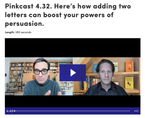 Weer zo’n heerlijk tip van Daniel Pink in gesprek met Jonah Berger. In dit gesprek toont Jonah aan dat je mensen daadwerkelijk in beweging kunt krijgen door één of twee letter toe te voegen aan de tekst. Dat doe je door van het werkwoord een zelfstandig naamwoord te maken. Wil je helpen of ben je een helper? Ga je stemmen of ben je een stemmer? Ga je hardlopen of ben je een hardloper? Eigenlijk maak je iets onpersoonlijks persoonlijk. Kijk maar naar het verhaal van Jonah Berger.