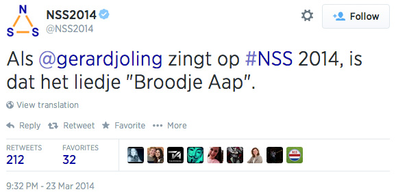 Twitter was voornamelijk het kanaal waarop inhoudelijk met stakeholders werd gecommuniceerd. Tenminste, dat was het streven van Tanja en de organisatie. De meest gelezen NSS2014-tweet bleek echter alles behalve inhoudelijk te zijn: