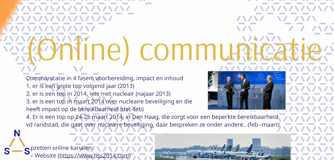 - Een fase voorafgaand aan het event. De website werd, naarmate het event dichterbij kwam, uitgebreid. Tijdens deze fase was de site vooral bedoeld om informatie te geven over wat de summit inhield. Bezoekers die kwamen voor bijvoorbeeld informatie over de mogelijke consequenties voor omwonenden, werden omgeleid naar de site van de gemeente Den Haag. De drie kernboodschappen van de NSS waren altijd op de homepage zichtbaar. Te weten: 1) het verminderen van gevaarlijk nucleair materiaal in de wereld, 2) het verbeteren van de veiligheid van alle nucleaire materialen en radioactieve bronnen en 3) het verbeteren van de internationale samenwerking. Tanja: “We hebben heel bewust gekozen voor een drieslag. En niet een vierslag. Dit omdat je een drieslag beter kunt onthouden en oplepelen. Juist doordat iedereen de drie boodschappen kan dromen, is de communicatie heel consistent en wordt die letterlijk overgenomen.”