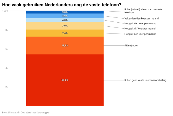 De vaste telefoon verdwijnt in Nederland steeds meer naar de achtergrond, al verloopt de ‘uitfasering’ misschien een stuk trager dan weleens wordt gedacht. 73% van de Nederlanders geeft aan de vaste telefoon zelden of nooit te gebruiken of zelfs helemaal geen vaste lijn meer te hebben. Van de 2000 ondervraagden in onderzoek van vergelijkingssite Slimster.nl gaf 18,8 procent aan (bijna) nooit meer gebruik te maken van de vaste lijn. Daar komt nog bij dat 54,4 procent überhaupt geen vaste telefoonaansluiting meer heeft.