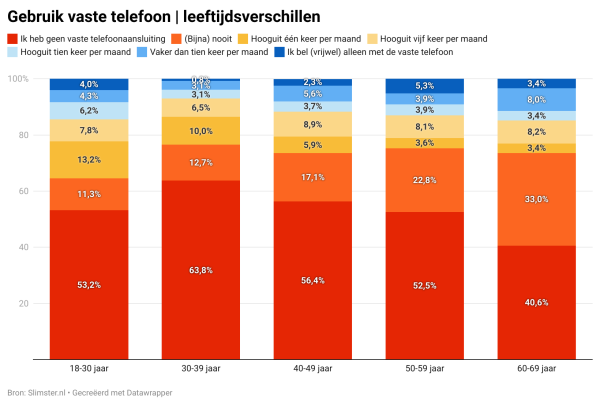 Het idee dat met name ouderen nog geregeld gebruikmaken van de vaste telefoon klopt dus niet helemaal. Zo is het percentage zestigplussers dat vaker dan eens per maand belt met de vaste lijn nauwelijks hoger dan onder twintigers (19,6 om 18,3 procent). Bovendien ligt het percentage dat aangeeft geen vaste lijn meer te hebben of er (vrijwel) nooit van gebruik te maken in elke leeftijdsgroep rond de 75 procent, behalve in de categorie 18 tot 30 jaar. Daar is het een kleine 65 procent. Dat verschil zou te maken kunnen hebben met financiële voordelen die kleven aan het gebruik van een vaste lijn, vooral als deze is inbegrepen in een internetabonnement, huurcontract of – inderdaad – de good old vaste ‘telefoon’ van pa en/of ma.