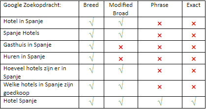 Bij het gebruiken van een breed zoekwoord, kunnen advertenties ook worden getoond voor relevante varianten van het zoekwoord. Denk hierbij aan spelfouten, synoniemen en andere relevante varianten. Het toevoegen van brede zoekwoorden kan helpen bij het vinden van nieuwe zoektermen die bij een product of dienst passen. Brede zoekwoorden vangen dus de meeste varianten op ten opzichte van de andere keywordtypes.