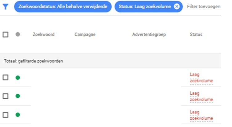Met deze instellingen zullen de zoekwoorden met laag zoekvolume vertoond worden.