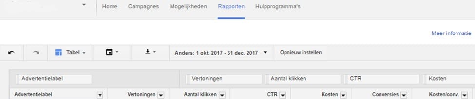 Wanneer je het label in de rapporten-editor hebt geselecteerd, kun je de metriekkolommen kiezen die je wilt evalueren. De resultaten die je te zien krijgt, zijn de basis van alle data van je gelabelde tekstadvertenties. Dit is een goede manier om een idee te krijgen hoe jouw advertenties hebben gepresteerd. Een onderschatte, maar wellicht handige techniek die je toch wat inzichten kan geven voor toekomstige optimalisatieslagen.