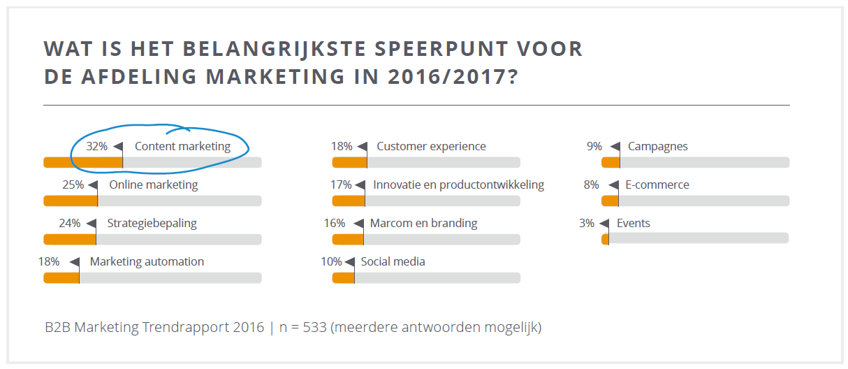 Sterker nog, zonder contentmarketing wordt het praktisch onmogelijk om leads aan te trekken en ze op te warmen voor sales. Zonder een contentmarketingstrategie kun je niet zoveel met marketing automation is dan ook mijn overtuiging. Als je kijkt naar het B2B Marketing Trendrapport geeft een derde van de respondenten aan contentmarketing als belangrijkste speerpunt te hebben voor 2016/2017 en 70 procent van de marketeers geeft aan contentmarketing al toe te passen.