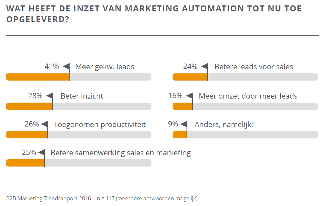Voor de marketeers die aangeven in 2016/2017 aan de slag te willen met marketing automation geldt als belangrijkste reden hiervoor: leadgeneratie (35 procent). Tenslotte wordt 46 procent van de respondenten afgerekend op hoeveel leads er worden gerealiseerd per jaar. Daarom vind ik het mooi om te zien dat 41 procent van de marketeers, die werken met marketing automation, aangeeft dat marketing automation hen ook meer gekwalficeerde leads heeft gebracht.