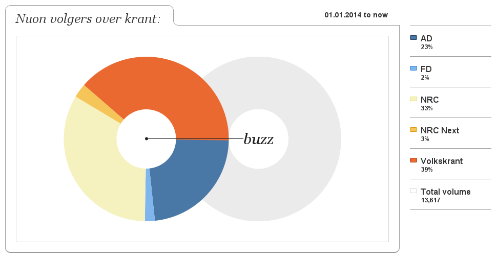 Natuurlijk biedt het niet een volledige steekproef van je klanten, maar het levert wel insights over de mensen die interesse hebben in je bedrijf. Als ik de volgers van Nuon op Twitter bijvoorbeeld bekijk, zie ik over welke krant ze in 2014 het meest praten.