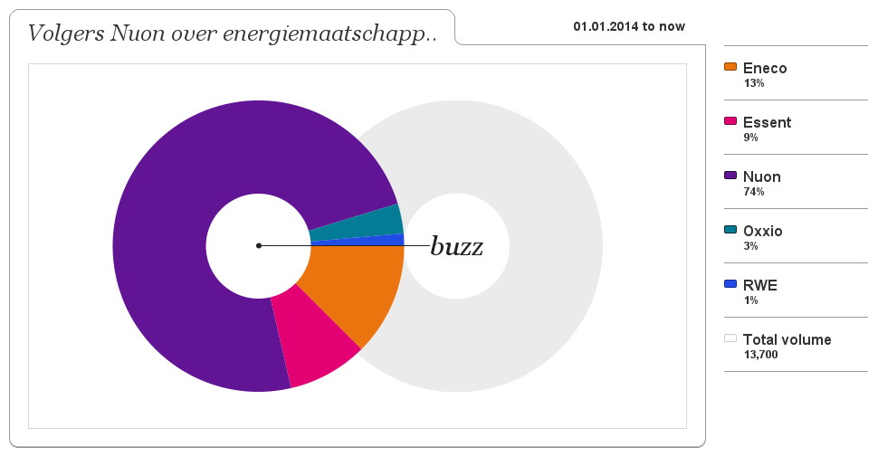 Dit is interessant voor marktonderzoek. Maar je kunt ook kijken of mensen die jouw account volgen (en dus zeer waarschijnlijk klant zijn of waren) iets tegen je concurrenten zegt. Dit is het aantal keren dat volgers van Nuon vanaf 1 januari 2014 energiemaatschappijen heeft genoemd.