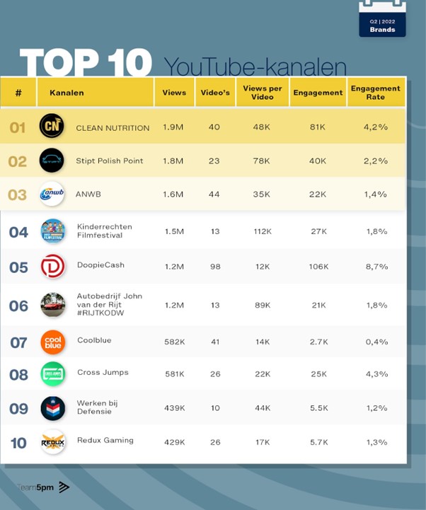 Ondanks dat de nummer twee Stipt Polish Point in totaal minder weergaven behaalde dan Clean Nutrition in de afgelopen drie maanden, genereerde het met 23 gepubliceerde video’s wel meer weergaven per video (77.600). Kinderrechten Festival sprong er het meeste uit met 112.000 weergaven per video. Verder had Clean Nutrition met 81.000 engagements wel bijna het dubbele aantal engagements dan Stipt Polish Point. Het merk met de hoogste engagement was uiteindelijk de nummer zes uit de lijst: DoopieCash – Traden & Investeren. Dit trading YouTube-kanaal behaalde met 98 gepubliceerde video’s in totaal 106.500 engagements en een indrukwekkende engagement rate van 8,7%. De video van DoopieCash met de meeste engagements was een live stream van 48 minuten met een live koers update van bitcoin en aandelen. Zoals in het artikel van het eerste kwartaal al werd benoemd, laat het kanaal hiermee naast de potentie van livestreams ook de stijgende populariteit van de personal finance en investeringsniche op YouTube zien.