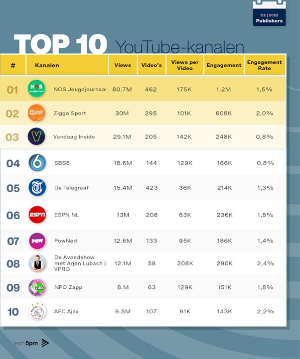 Na de nummer één te zijn geweest in het eerste kwartaal en in de terugblik op het gehele jaar 2021, wist NOS Jeugdjournaal ook in de afgelopen drie maanden de koppositie vast te houden. Het nieuwsprogramma behaalde de afgelopen drie maanden 80,6 miljoen weergaven, nog weer 16 miljoen weergaven meer dan in het eerste kwartaal. De afgelopen maanden publiceerde het 462 video’s (de meeste video’s uit de lijst) en wist hiermee 174.500 weergaven per video te genereren. Alleen De Avondshow met Arjen Lubach | VPRO wist dit te overtreffen door meer dan 207.000 weergaven per video te behalen. Het programma heeft het bereik van de show slim gekoppeld aan het YouTube-kanaal.