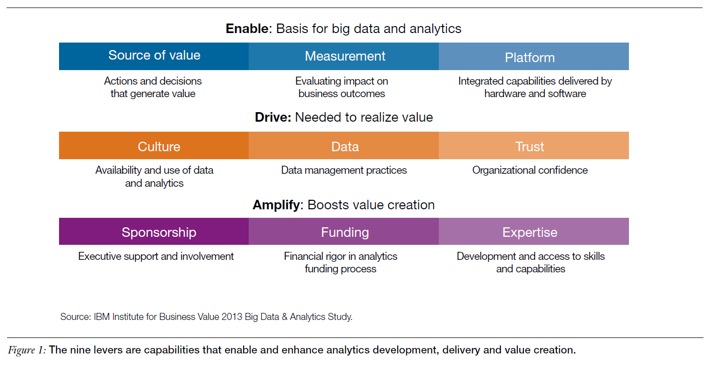 Deze anekdote werd verteld door dr. Marc Teerlink, global strategist bij IBM. Maar niet ieder bedrijf verandert zo radicaal zijn strategie. Marc noemt drie niveaus van data-driven organisaties. In de beginfase draait het onder andere om genoeg investeringen, het juiste platform en het vertrouwen van de medewerkers in de betrouwbaarheid van elkaars data. Dan kan de organisatie zich met data-analyse gaan ‘accelereren’. De juiste waardepropositie, data en metingen helpen om de data-driven organisatie naar een gevorderd niveau te tillen. Maar pas met de buy-in van het management, expertise en een datagedreven cultuur bereiken organisaties het expertniveau. Met een datagedreven cultuur verandert de organisatie pas echt radicaal. Er gaat vaak een aantal jaar overheen voordat zij echt een Netflix-effect veroorzaken.