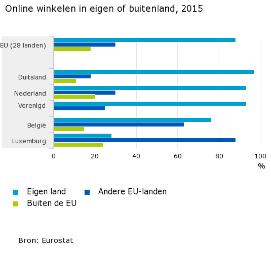 Kijken we naar online aankopen, dan blijkt uit Eurostat data dat in 2015 71 procent van de Nederlanders online een aankoop deed, tegen 55 procent van de Belgen. Wel is opvallend dat Belgen verhoudingsgewijs vaker kopen bij buitenlandse webshops.