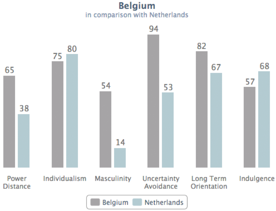 Toch afzetten in België? De taal is niet per sé een probleem. Je zou er zelfs voor kunnen kiezen om je te richten op Vlaanderen. De meeste Nederlandse bedrijven doen dit ook. Denken dat daarmee de cultuurverschillen kleiner worden is echter een fout. In de 2,5 jaar dat ik in België woonde en werkte, en Nederlandse bedrijven adviseerde over zakendoen in België, bleek dat juiste een reden voor onderschatting. De taal is hetzelfde, dus kunnen we communiceren en zakendoen. De cultuurdimensies van Hofstede laten echter mooie verschillen zien die opgaan voor geheel België. In mijn tijd in België werd vaak gesteld dat Zuid-Europa begint bij België.