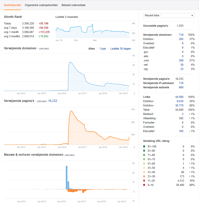 Er zijn nog meer opties. Zo krijg je in één overzicht alle statistieken van de website die je hebt ingevoerd. Dit overzicht bestaat onder andere uit Ahrefs Rank, aantal links, aantal verwijzende domeinen, een overzicht van de groei/daling van links over de laatste jaren en nog veel meer. In het overzicht hieronder een kleine impressie.