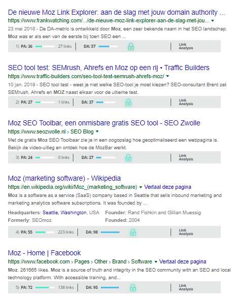Het grootste voordeel van Moz en de Mozbar ten opzichte van andere tools, is dat je de resultaten van diverse SERP’s in één keer kunt koppelen aan de tool. Wanneer je ‘zoekterm X’ intypt in Google, krijg je in één oogopslag een overzicht van Moz. Hierin vind je de PA (page authority) en de DA (domain authority). Tevens heb je in één oogopslag het aantal links dat naar de specifieke pagina verwijst en het aantal links dat naar het gehele domein verwijst.