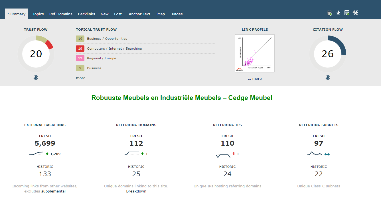 Behalve topics heeft Majestic ook een citation flow en een trust flow. Hierdoor krijg je niet alleen een idee van de pure waarde (citation flow), maar ook een idee van de betrouwbaarheid (trust flow). Dit is ideaal in het bepalen van mogelijke targets om te benaderen.