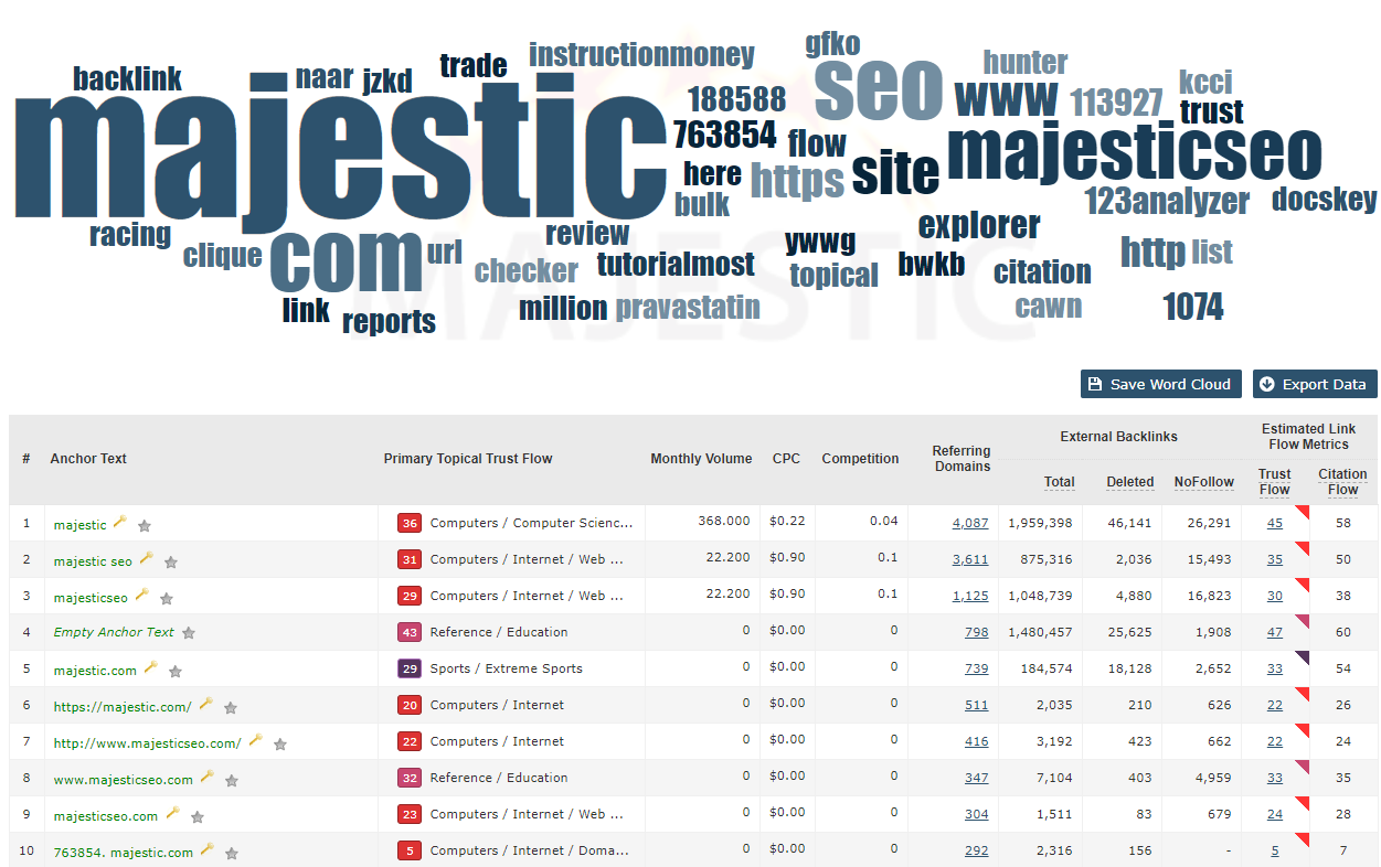 Majestic biedt ook een zogeheten Word Cloud, waarin je in één overzicht de anchorteksten van het de URL of van het gehele domein te zien krijgt. Hierdoor zie je in één oogopslag welke anchorteksten er met welke frequentie worden gebruikt. Daarbij is dit onderdeel ook te combineren met andere tools of extensies, zoals je in het overzicht hieronder kunt zien. Zo heb ik de tool gekoppeld met de chrome extensie ‘keywords everywhere’, waardoor ik gelijk een indicatie krijg van het zoekvolume op een bepaalde term, alsmede de concurrentie en de CPC.