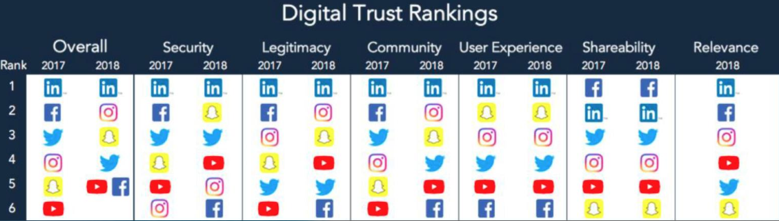 Wat vooral opvalt, als we toch de vergelijking tussen LinkedIn en Facebook maken, is dat Facebook de laatste tijd veel problemen heeft met het vertrouwen dat ze genieten, mede door de privacyschandalen uiteraard. Uit onderzoek van ‘Business Insider Trust Study’ uit 2018 blijkt dat LinkedIn daarentegen erg goed scoort op het gebied van digitaal vertrouwen: