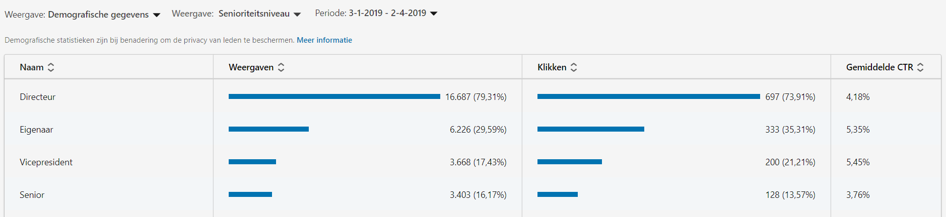 Een functie die ontzettend handig is in je LinkedIn-advertisingaccount, is Demographic Insights. Deze geeft inzicht in welke doelgroepen je advertenties hebben bereikt en hoe er per doelgroep op wordt gereageerd. Op basis van deze data voer je de targeting-optimalisatie uit. Zie je dat je heel veel CEO’s bereikt, maar dat het CTR en de conversieratio op die doelgroep fors achterblijft ten opzichte van de marketingmanagers? Dan wil je wellicht de CEO’s uit de doelgroep halen en opnieuw targeten in een nieuwe campagne, met een andere boodschap.