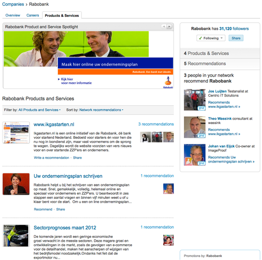 In Nederland zijn er nog niet veel bedrijven die hun bedrijfspagina hebben voorzien van diensten en producten die ze leveren. Enerzijds omdat deze dienst nieuw is en anderzijds omdat er weinig over geschreven is. In mijn boek (reclame) dat in mei verschijnt wordt het uitgebreid uitgelegd. Maar er zijn nu al enkelen die dit wel doen zoals de Rabobank. Zij hebben dan ook meer dan 30.000 volgers die wachten op relevante updates. Ik ben er eentje van en ik heb nog nooit een update gezien. Maar, daar gaat nu misschien wel verandering in komen.