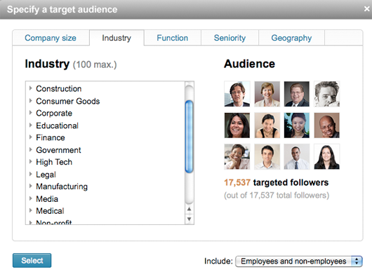 Vanaf nu is het voor een select groepje organisaties mogelijk om gebruik te maken van Targeted Updates. Met Targeted Updates kun je kiezen naar welke volgers je een update wilt sturen als bedrijf. Zeg maar hetzelfde als een algemene statusupdate die je als persoon kunt plaatsen, maar dan naar een specifieke groep mensen. Je kunt er daarbij voor kiezen dit te sturen naar medewerkers, niet medewerkers, specifieke functiegebieden of branches (industries) en zelfs of je dit naar grote of kleine bedrijven wilt sturen.